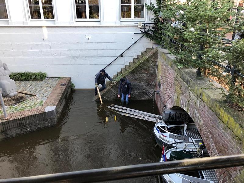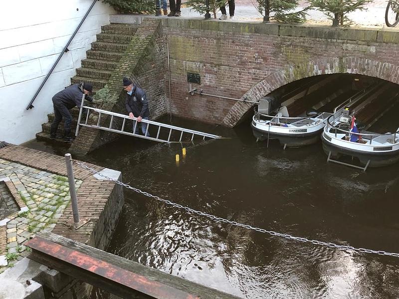 Er worden twee waterpakken aangeschaft zodat de schippers in het water kunnen staan en deze loopbruggen niet meer nodig zijn. De hoogte van het water is 3.60 m op dit moment.