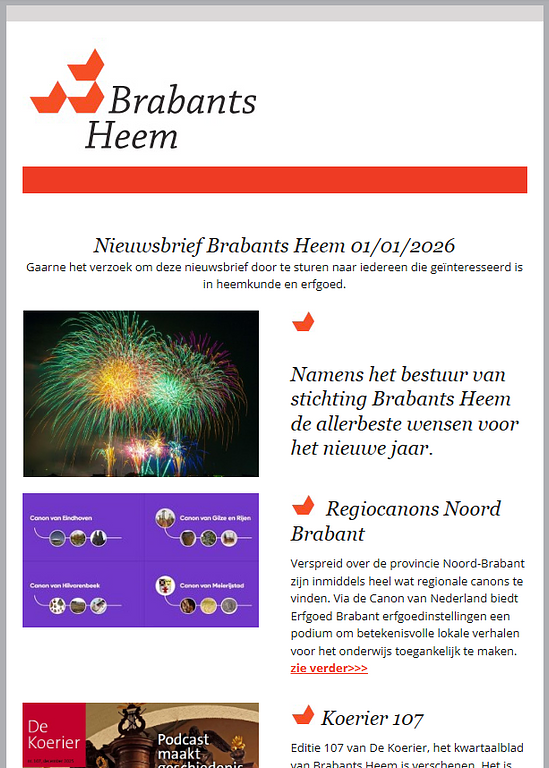 Algemeen Nieuwsbrief Brabants Heem - januari 2026 05 januari 2026 Lees hier de nieuwsbrief van Brabants Heem. De eerste van het jaar 2026. image.png 295 KB